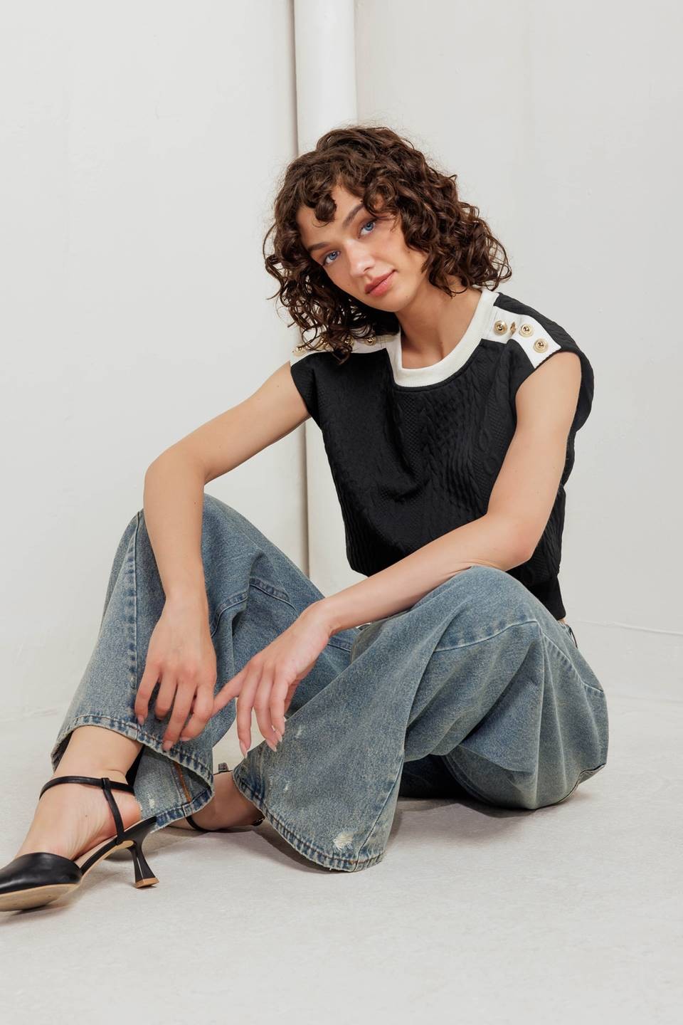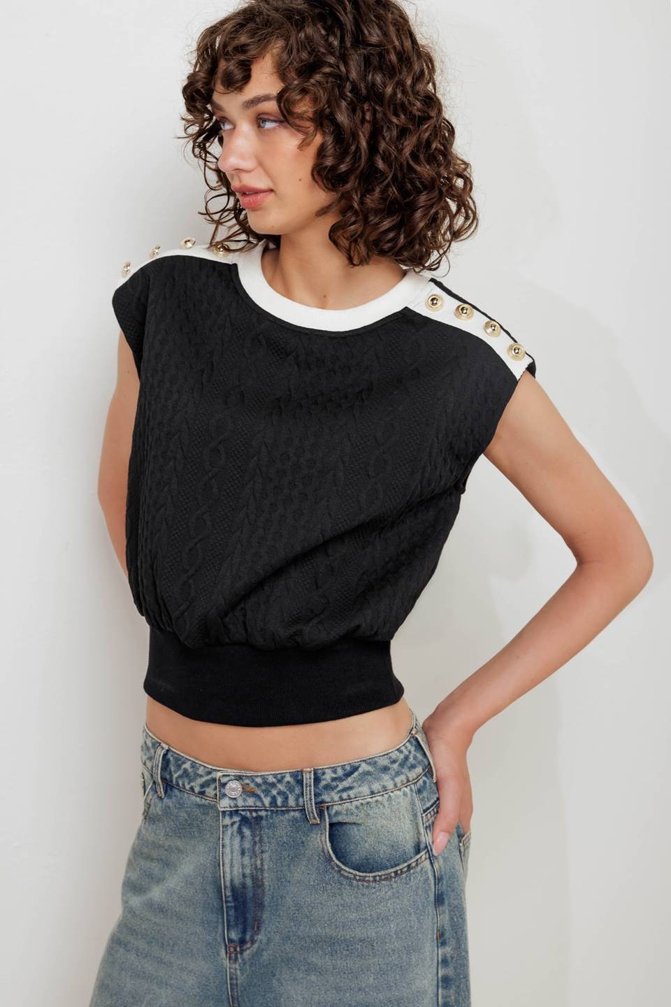 A knit top featuring round neckline, button at shoulder and ribbed waist. Matching skirt FK1219 Details: Self : 95% Polyester 5% Spandex Contrast 1, 2 : 75% Cotton 20% Polyester 5% Spandex Size & Fit - Model is 5'8" And Wearing Size Small - Measurements Taken From Size Small - Approx. Length: 23"