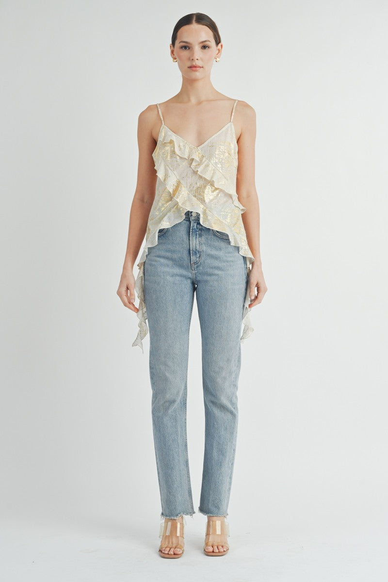- Lightweight metallic fabric with a subtle shimmer - Cascading asymmetrical ruffle detail - Adjustable spaghetti straps for a customized fit - Asymmetrical hemline for added movement - Perfect for parties, date nights, and festive gatherings