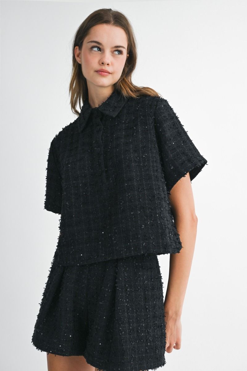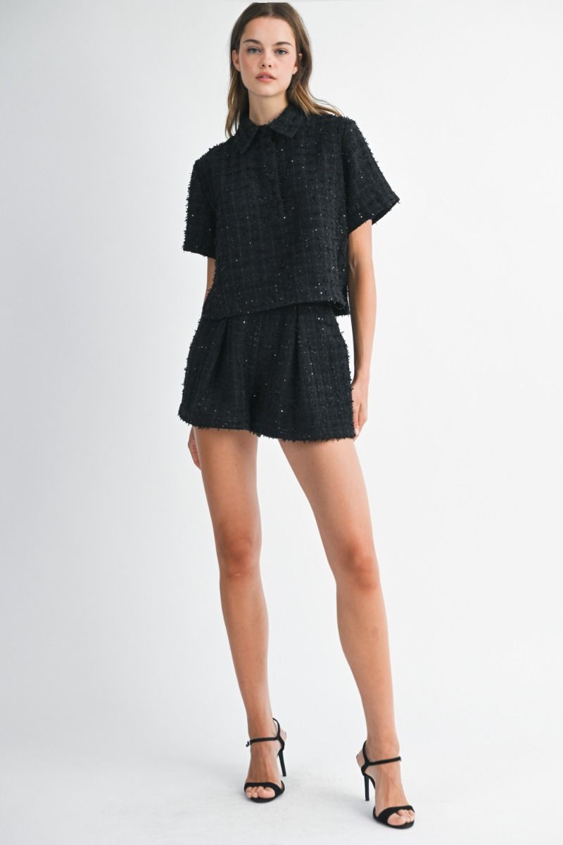 Lurex tweed collared half button down short sleeve top and matching pleated front shorts set. Shorts has side invisible zipper and pockets. Lining.