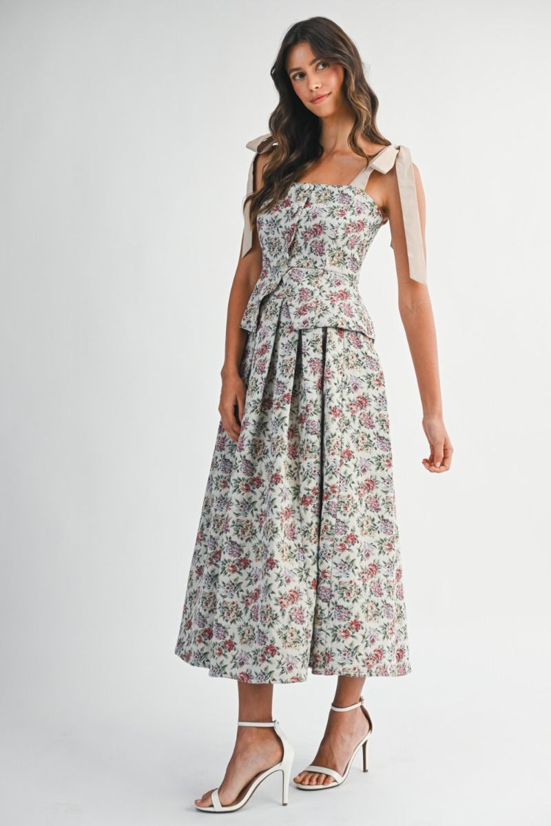 Tapestry floral jacquard contrast self tie strap peplum top and matching midi skirt set. Top has back exposed zipper. Skirt has side invisible zipper.