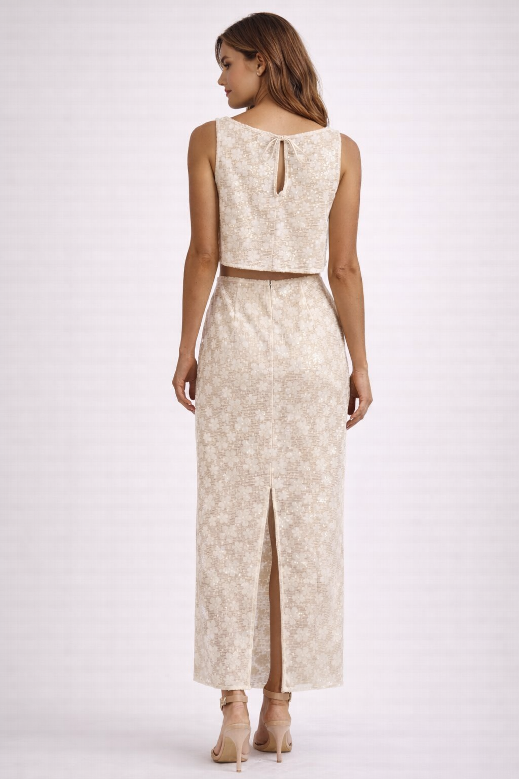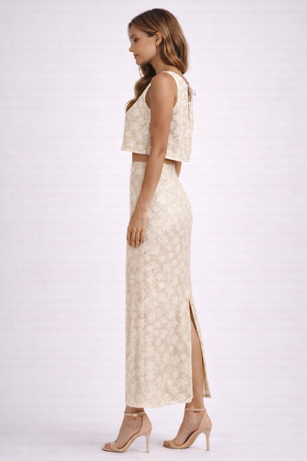 Sequins trim meshed crop top with pencil skirt fashion set. Flower shape sequins trimed on the mesh fabric. Crop top with doule layer front. Pencil skirt with mesh bottom and double layer hipe cover. Back with zipper and split bottom.