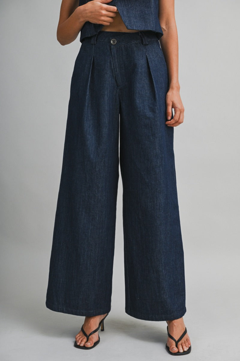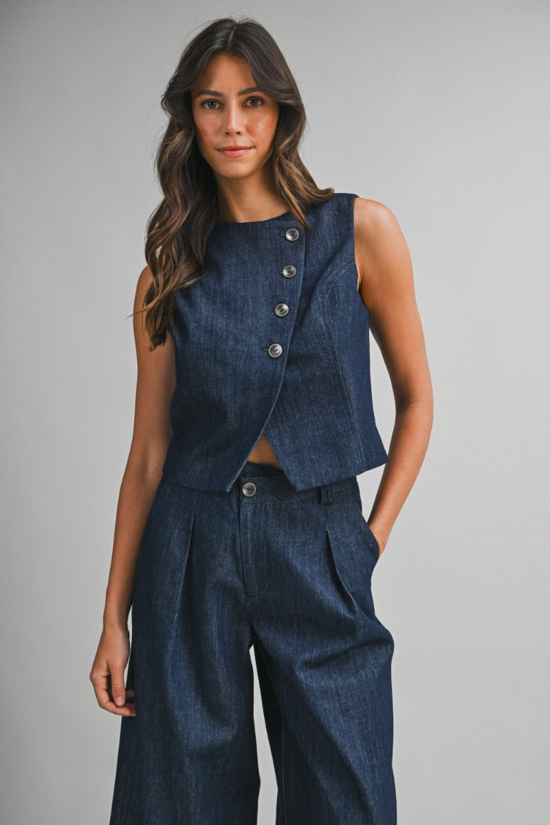 Two-piece set featuring a sleeveless top with an asymmetric button closure and clean, structured lines. Paired with matching high-waisted wide-leg pants designed with front pleats for a tailored drape.