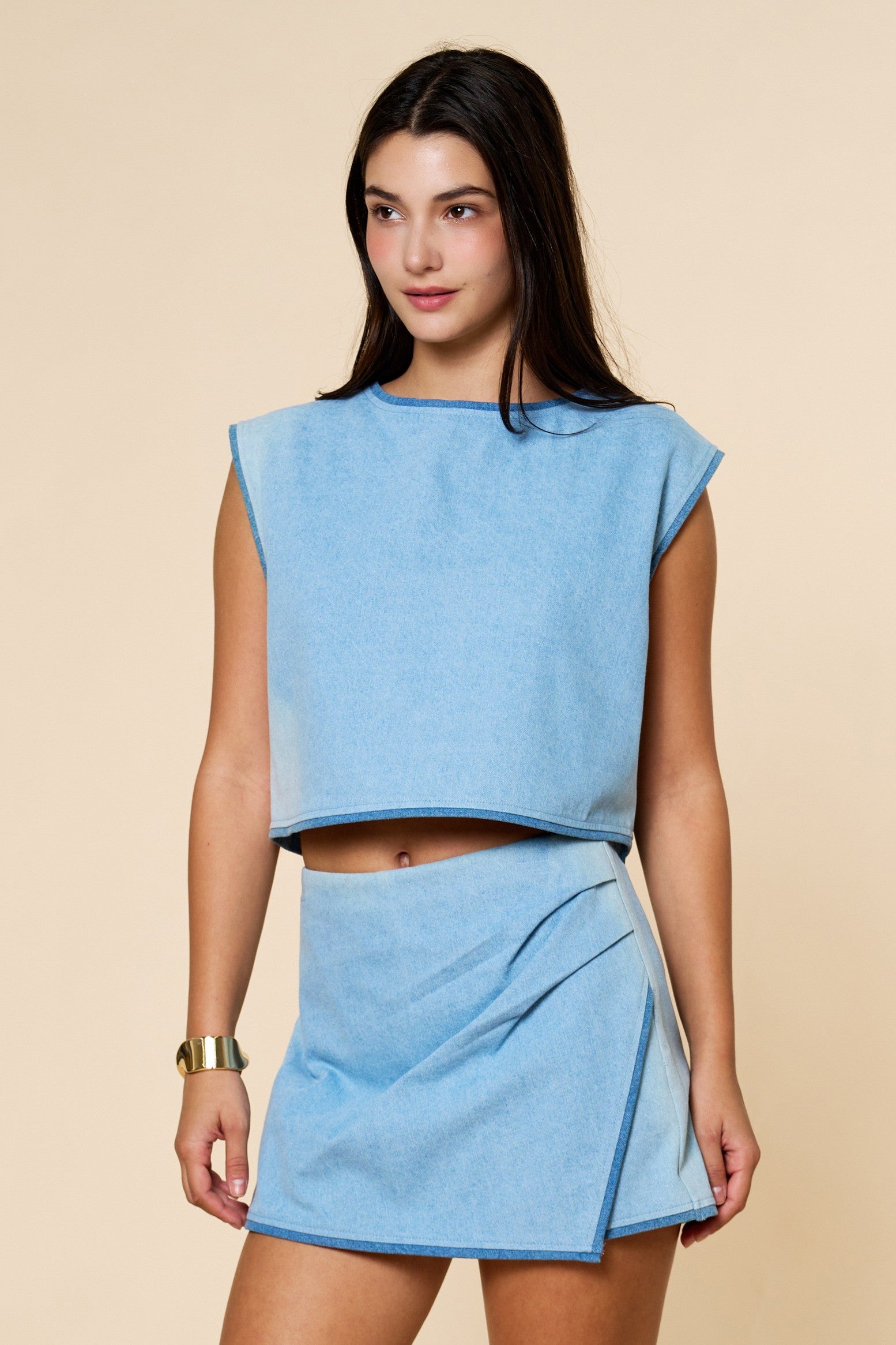 Edgy & Chic: Denim Contrast Top with Wrap Skirt - Stylish contrast denim design for a bold, modern look - Flattering wrap skirt for an effortlessly sleek silhouette - Versatile two-piece set for endless styling options - Lightweight and comfortable for all-day wear