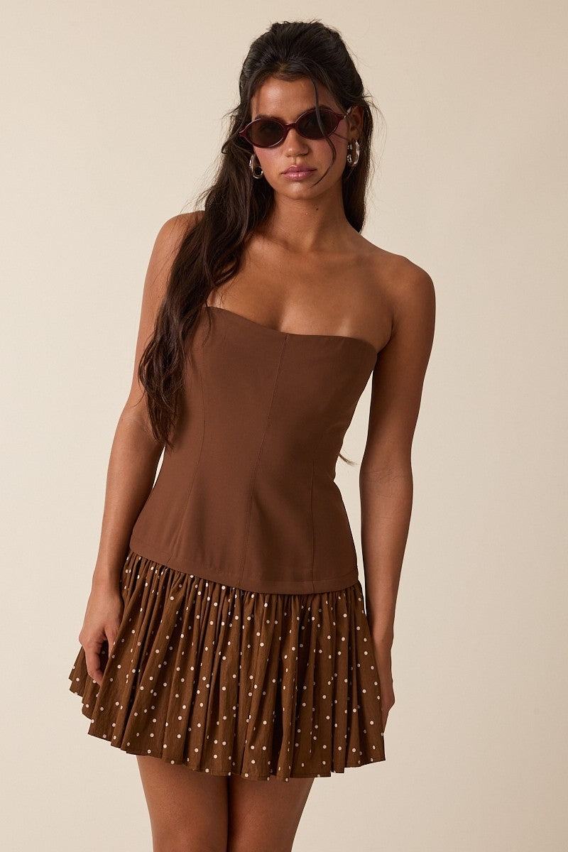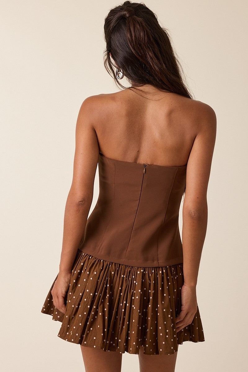 Half Solid Body & Half Polka Dot Skirt Straight Across Strapless Back Hook & Eyes Back Zipper down Tube Mini Dress SELF:100%POLY LINING:100%POLY * Model Info: Height 5'8'' / 176 cm Bust 32BB Waist 22'' / 55 cm Hips 34.5'' / 88 cm