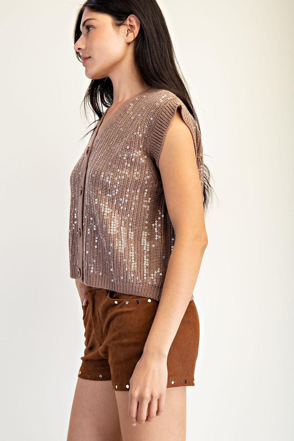 Ribbed knit vest with full sequin embellishment - V-neckline with button front closure - Relaxed fit for easy layering - Soft stretch knit for comfort and flexibility - Shimmering finish adds a touch of glam - Final Sale