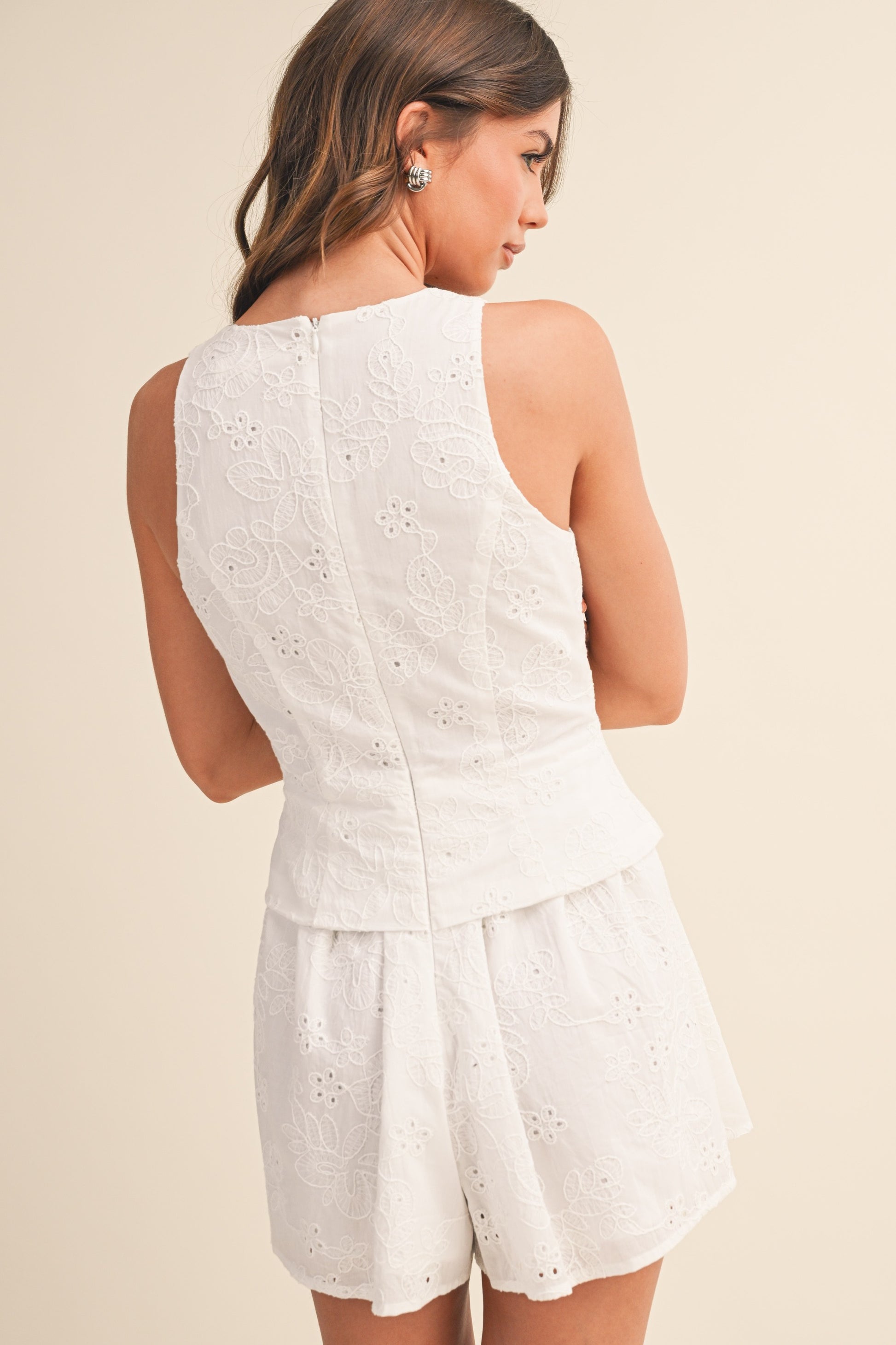SLEEVELES EYELET ROMPER WITH BACK ZIPPER CLOSURE AND JEWELED NON FUNCTIONAL BUTTON DETAILS